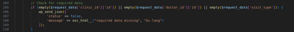 if (empty($request_data['clinic_id']['id']) || empty($request_data['doctor_id']['id']) || empty($request_data['visit_type'])) {