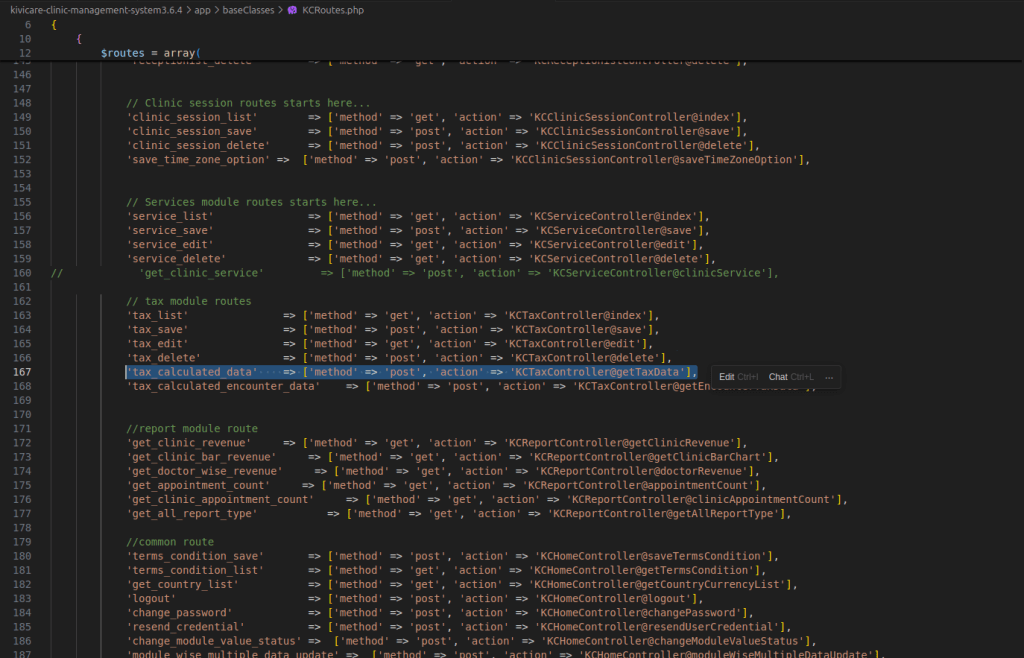 KCRoutes.php dosyasında, tax_calculated_data aksiyonu tanımlanmış olup, gelen istekleri KCTaxController@getTaxData metoduna yönlendirmektedir. Bu eşlemenin anlaşılması, zafiyetin kod tabanındaki yerini belirlemek için kritik öneme sahiptir.